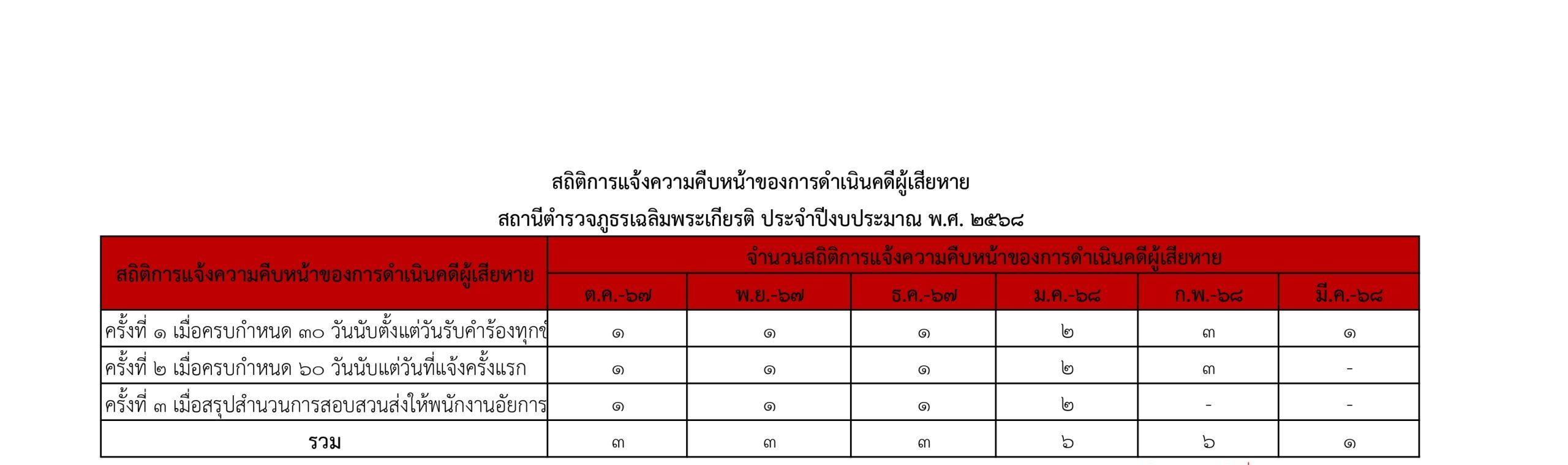 ข้อมูลผลการดำเนินงานในเชิงสถิติ แจ้งความคืบหน้าคดี ประจำปีงบประมาณ พ.ศ.2568 (แยกเป็นรายเดือน)