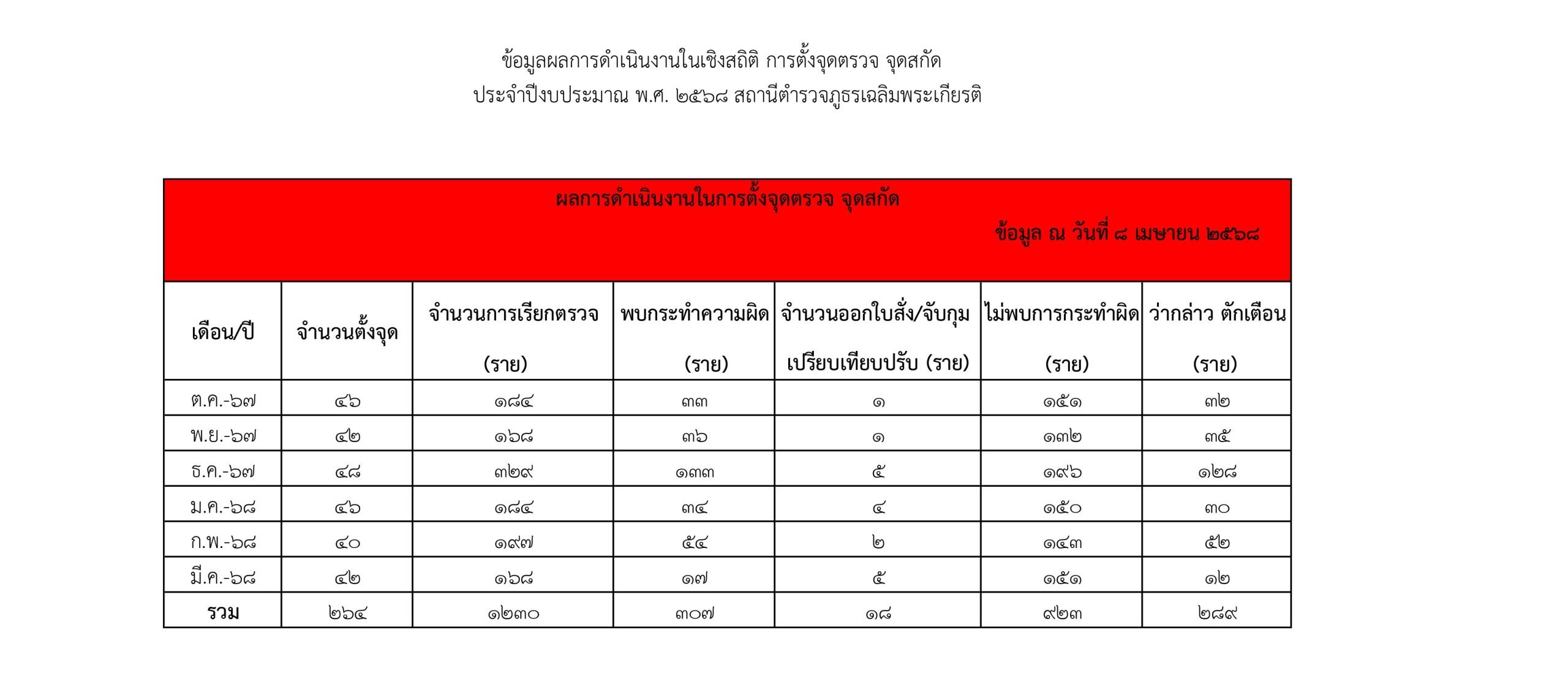 ข้อมูลผลการดำเนินงานในเชิงสถิติ การตั้งจุดตรวจ จุดสกัด ประจำปีงบประมาณ พ.ศ.2568 (แยกเป็นรายเดือน)